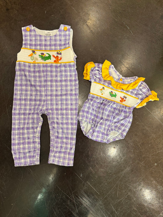 Make your little ones stand out in our purple plaid Louisiana theme smocks for Mardi Gras!