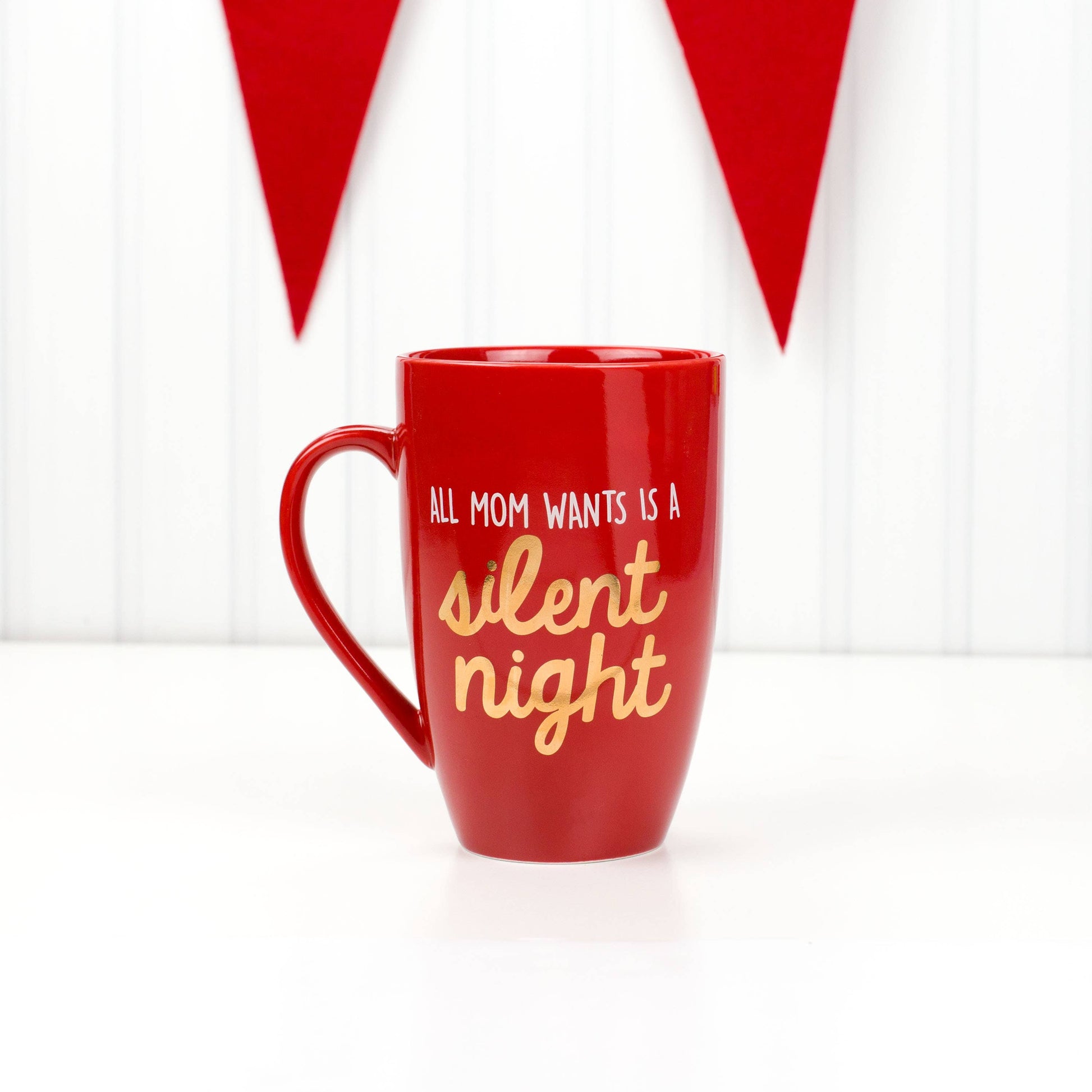 • Includes one red ceramic holiday mug printed with the words “all mom wants is a silent night” in gold