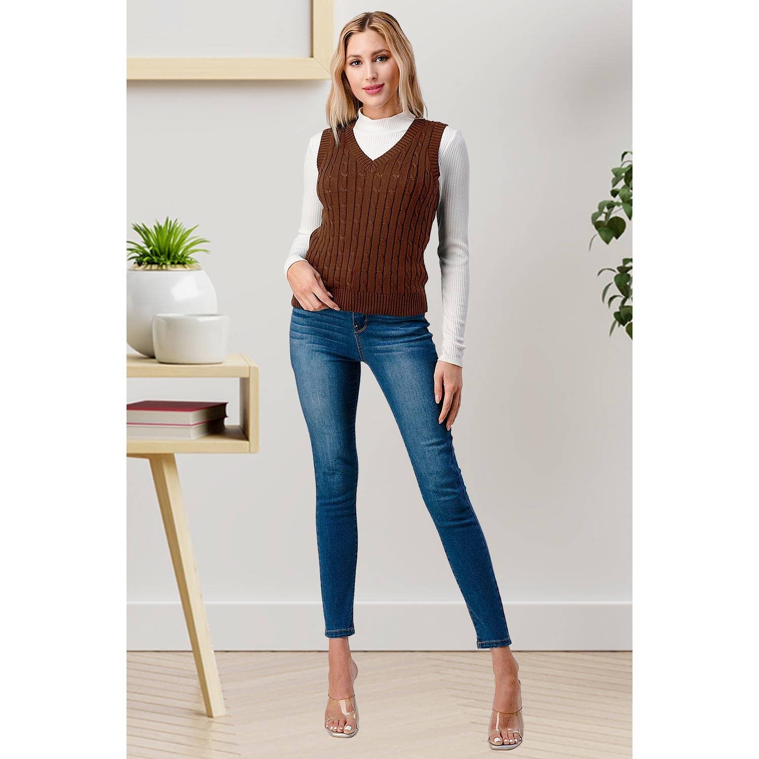 CABLE KNIT V NECK SWEATER VEST