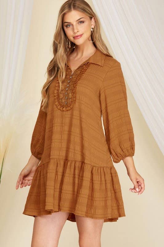 CARAMEL TEXTURED CROCHET PLACKET WOVEN MINI DRESS