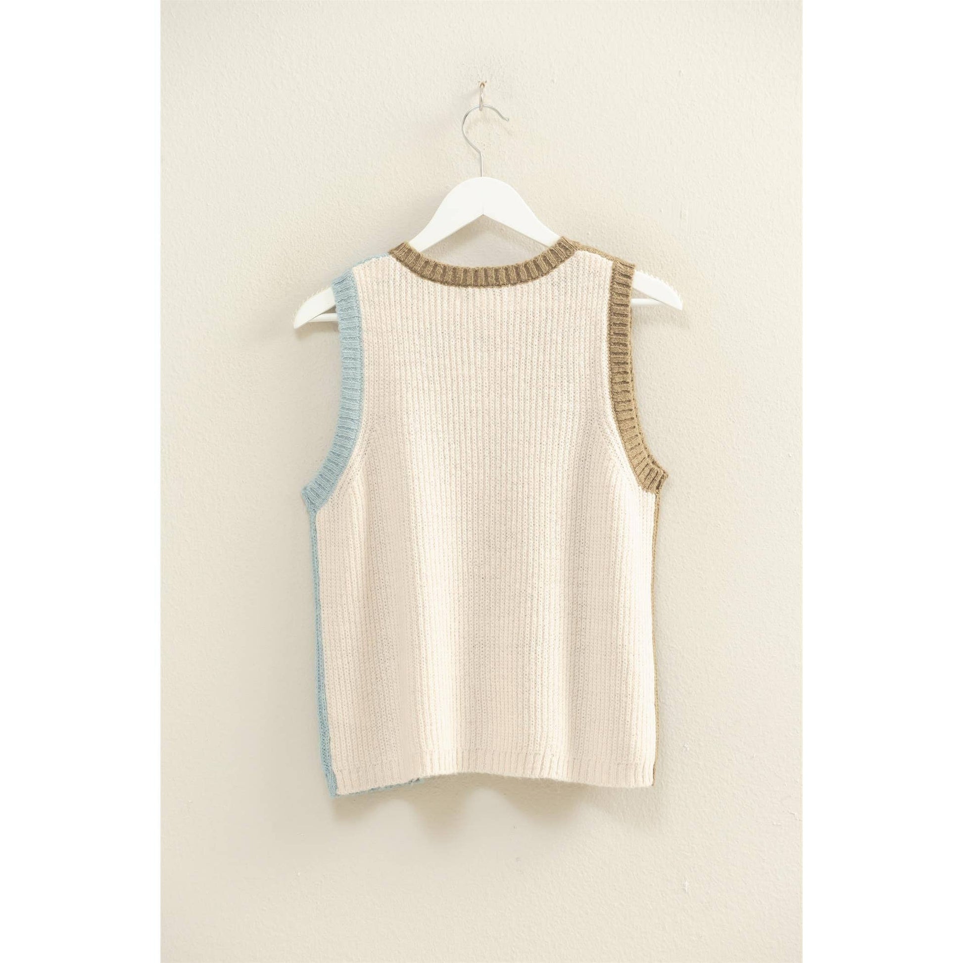 Discover the unique charm of this sleeveless,color block sweater featuring a distinctive line of buttons along the side. Ideal for a touch of casual sophistication, this piece transcends seasons. Effortlessly versatile, it can be styled over a collared shirt or under a blazer for a polished look. 70% acrylic 30% nylon Model Is 5' 6" Tall, 32" Chest, 24" Waist, 32" Hips And Wearing A Size Small Imported. Designed In The USA