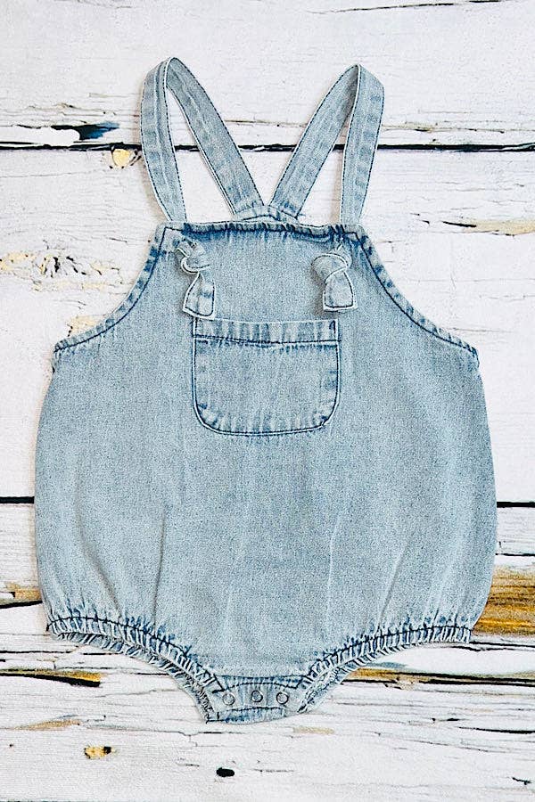 Romper features with washed denim fabric with adjust strap and pocket at front.