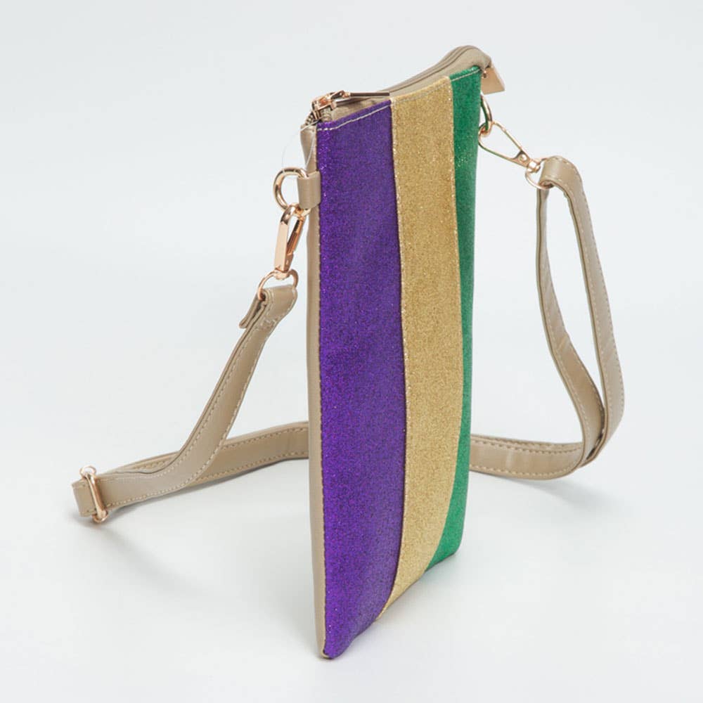 Glittered Vertical Strip Mardi Gras Flat Mini Crossbody Bag: Gold