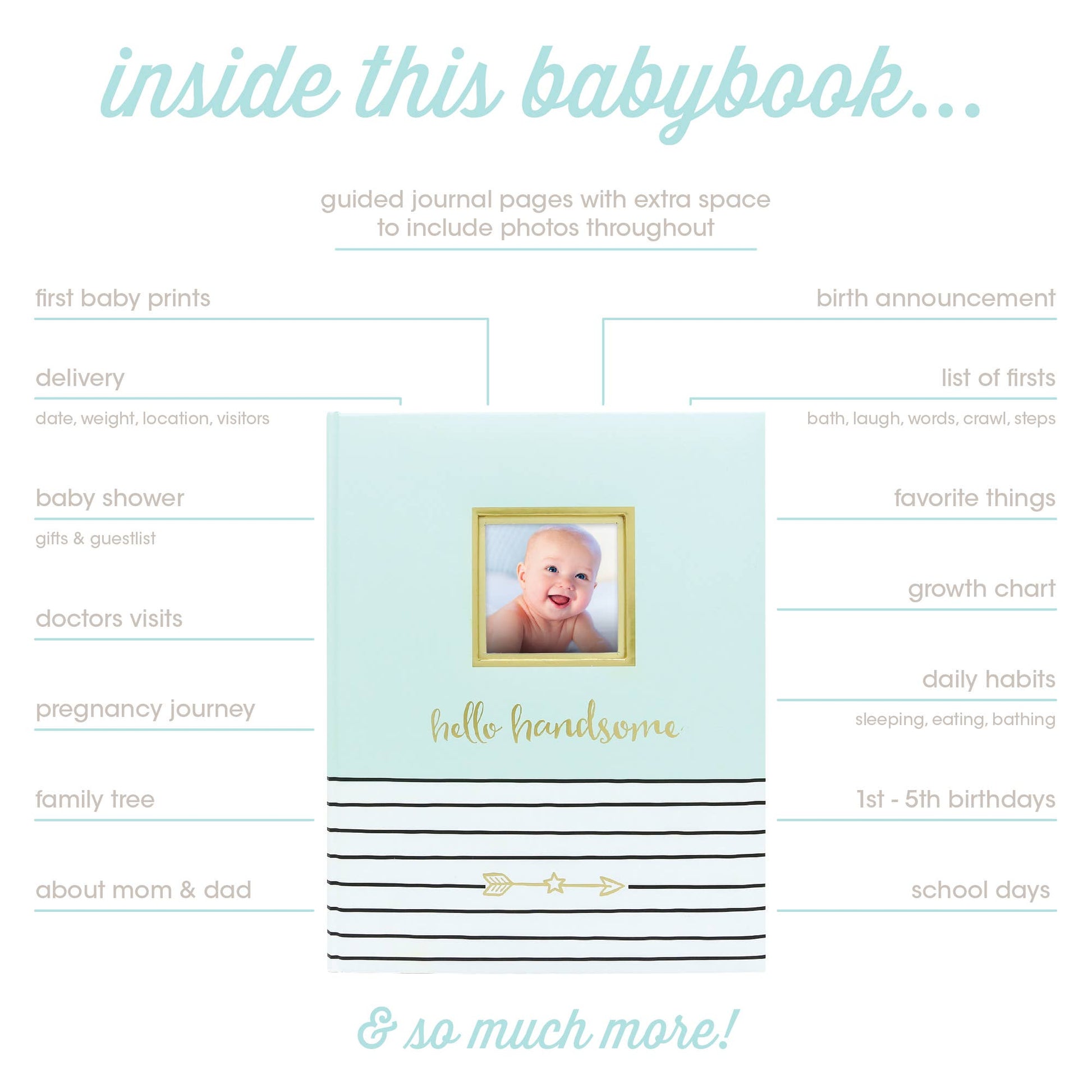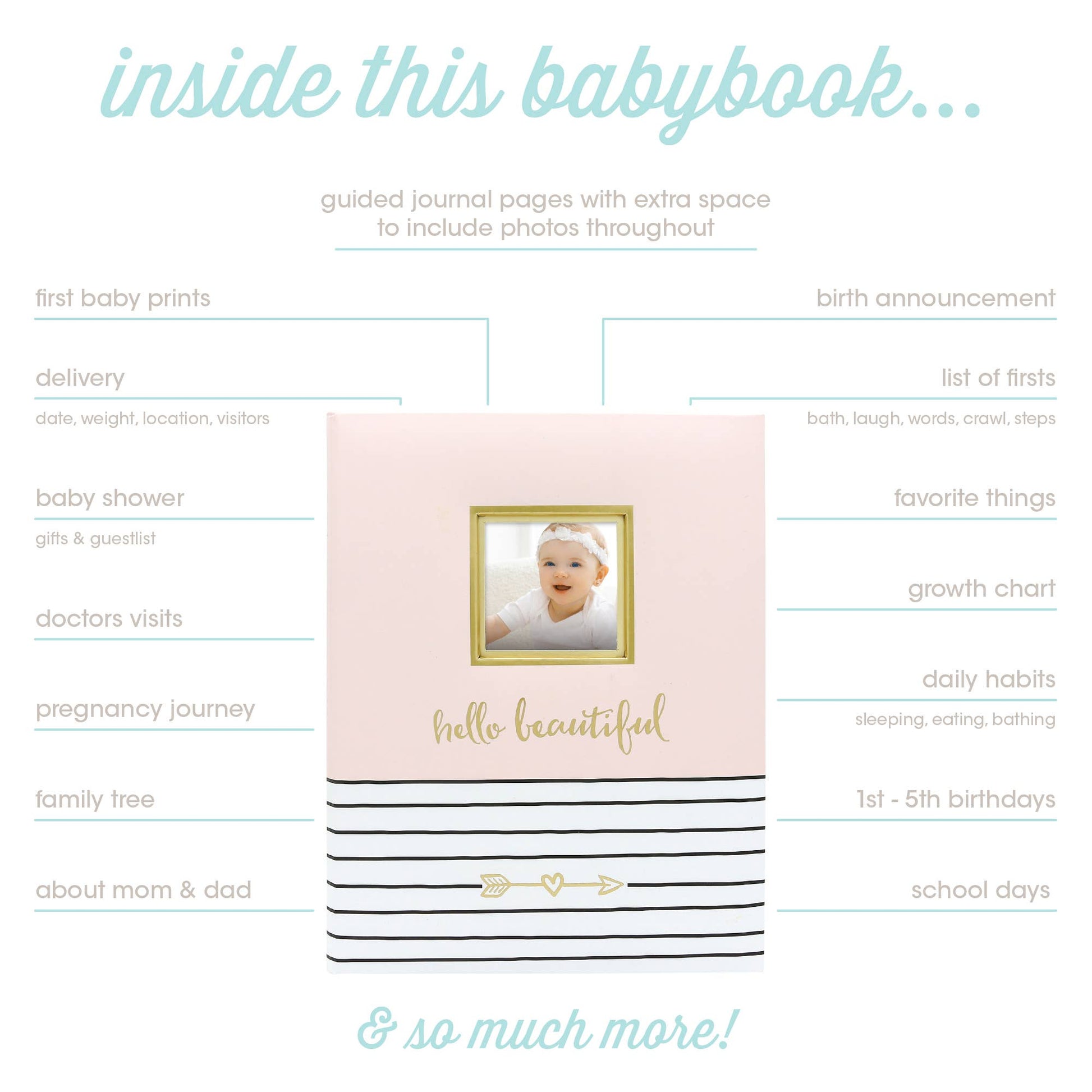 · Introducing the 'Hello Beautiful' baby book, with its charming fonts and 50 pages, perfect for capturing and sharing your precious stories. The stylish cover includes a 3” x 3” slot for your favorite baby photo.