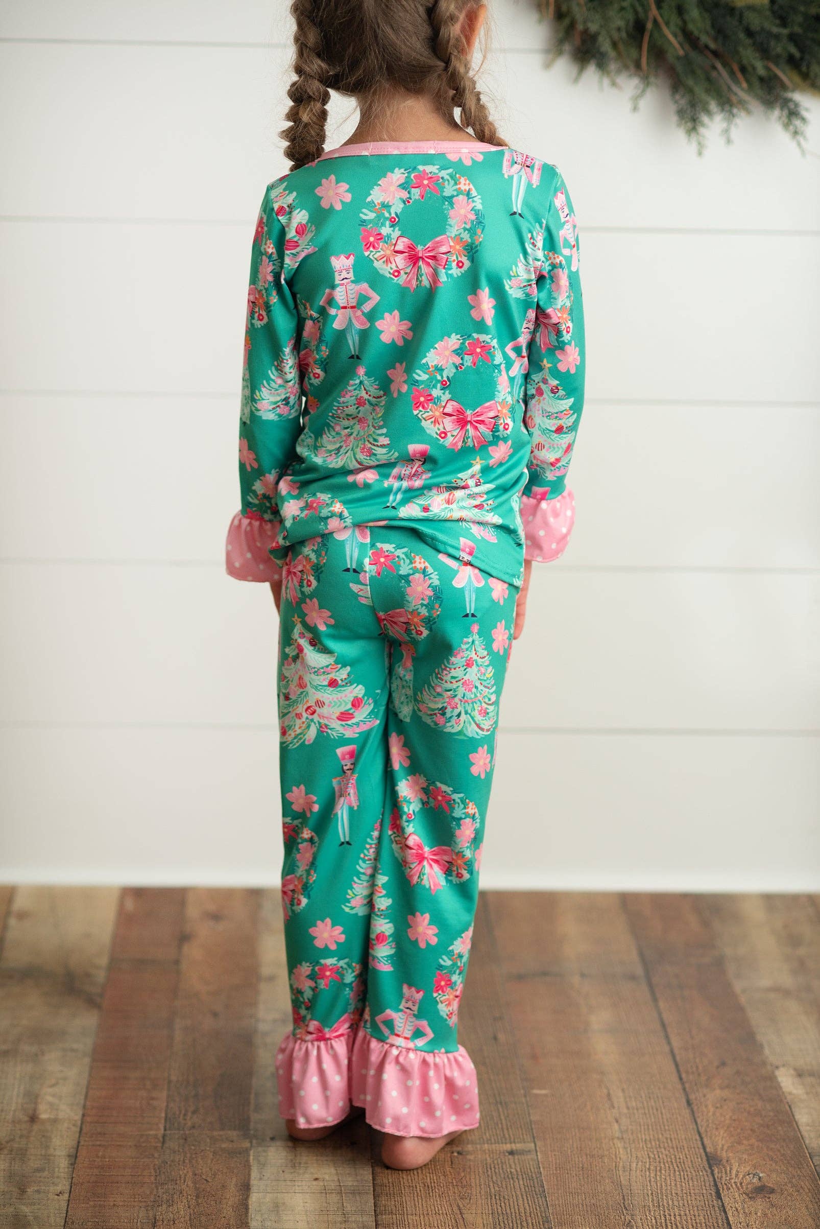 Girls two piece lounge play set includes green & pink nutcracker holiday tree print long sleeve top with matching pants. Buttons and ruffle details galore. SUPER SOFT FABRIC! Perfect everyday loungewear for cozy winter holidays.