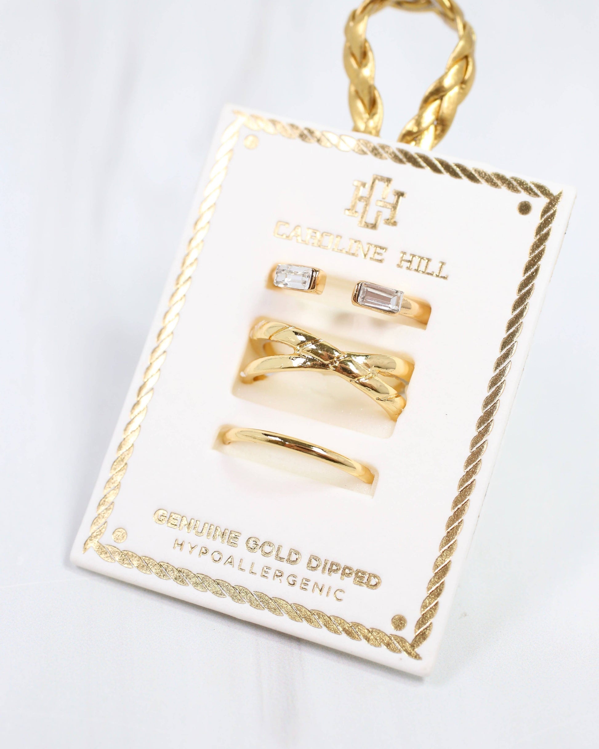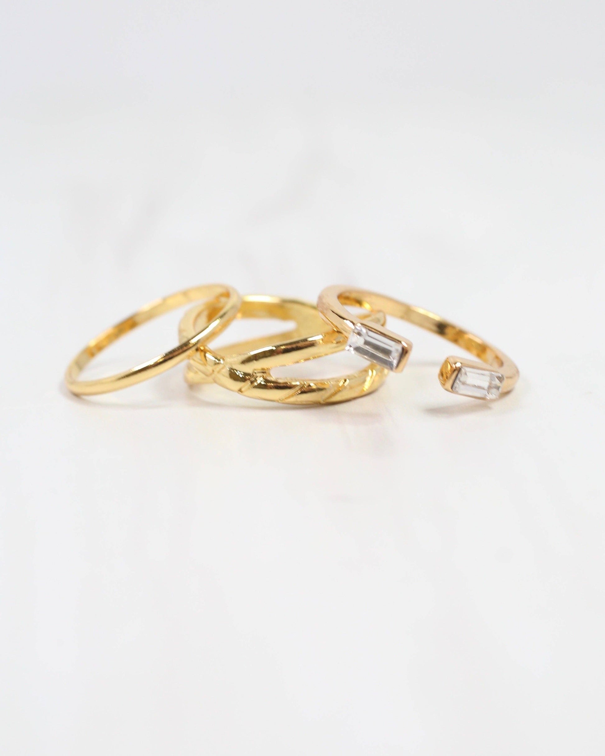Mix and match with the Kit Ring Set Gold! This playful trio features three gold-dipped rings: an open ring with sparkling cz details, a trendy crossed design, and a sleek, thin gold band. Wear them together or separately to add a touch of fun and versatility to your everyday style.