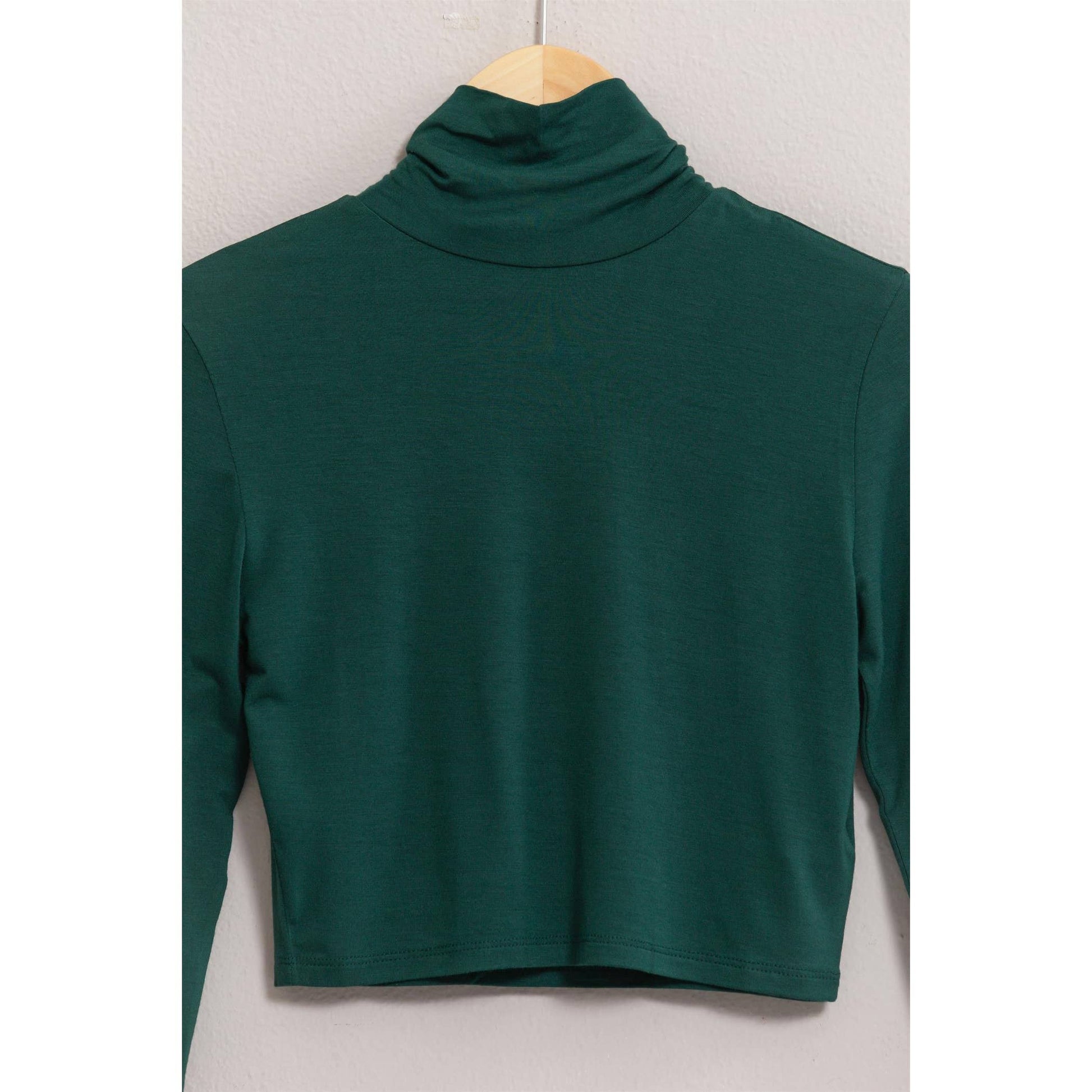 This Sleek Turtleneck Crop Top Features A Form-Fitting Design And A Stretchy Fabric That Hugs Your Body For A Flattering Silhouette. The Long Sleeves And High Neck Provide A Modern, Chic Look, Perfect For Layering Or Wearing On Its Own. Pair It With High-Waisted Bottoms For A Trendy, Stylish Outfit. 95% Rayon 5% Spandex Model Is 5' 7" Tall, 32" Chest, 25" Waist And 36" Hips And Wearing A Size Small Imported. Designed in the USA