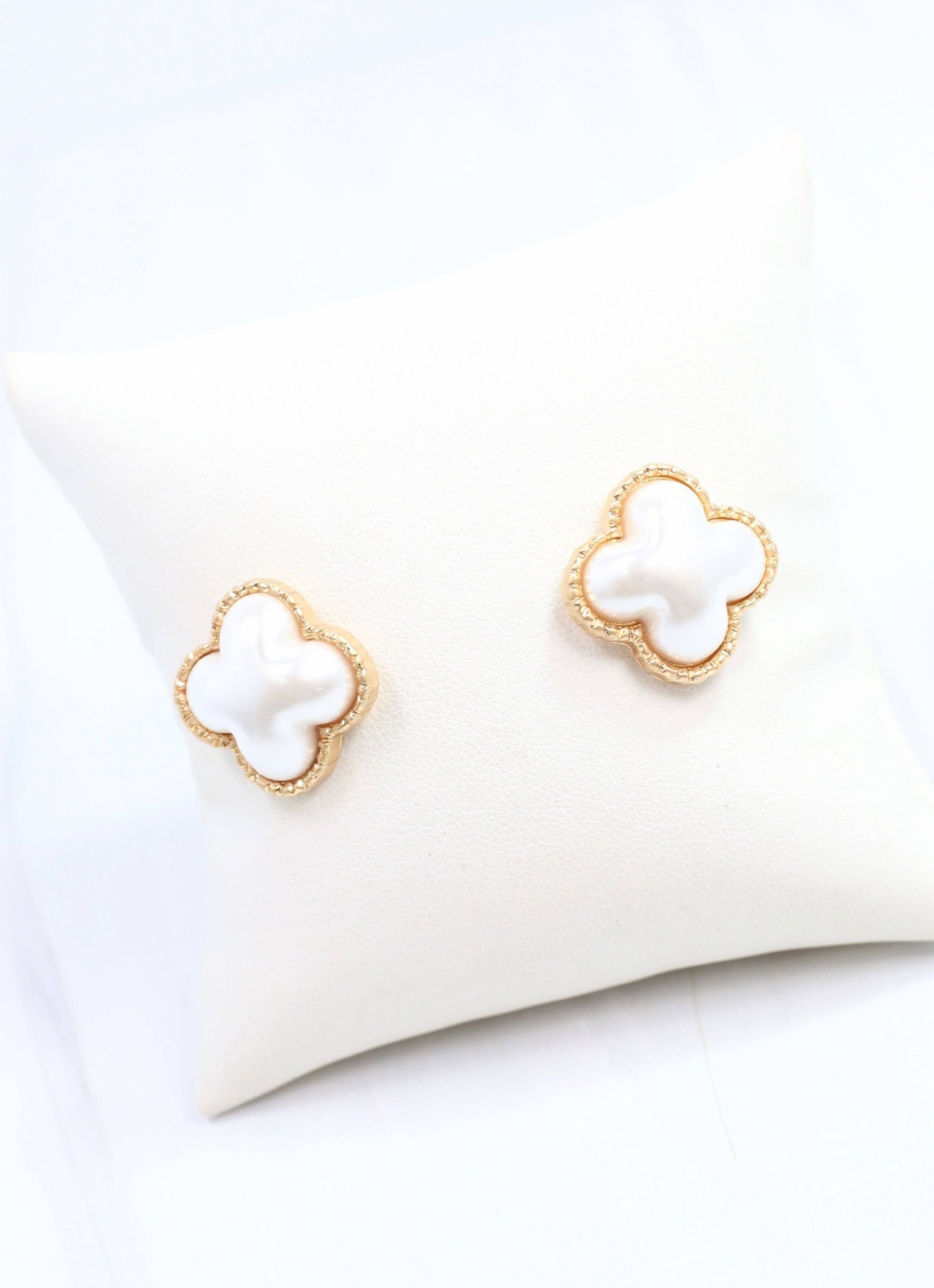 This elegant clover stud earring features a puffed pearl center in a gold setting. It has a vintage yet trendy look to accessorize any look.