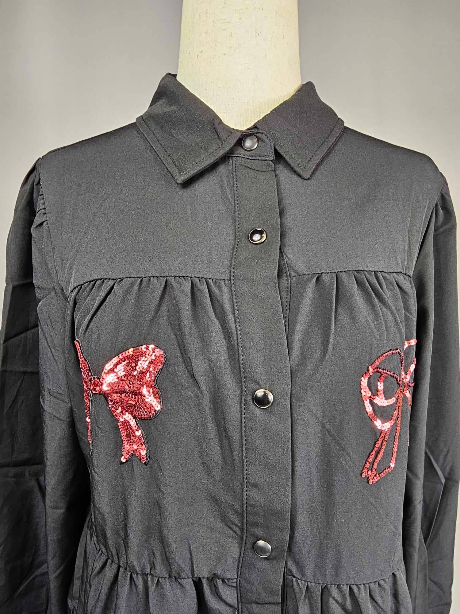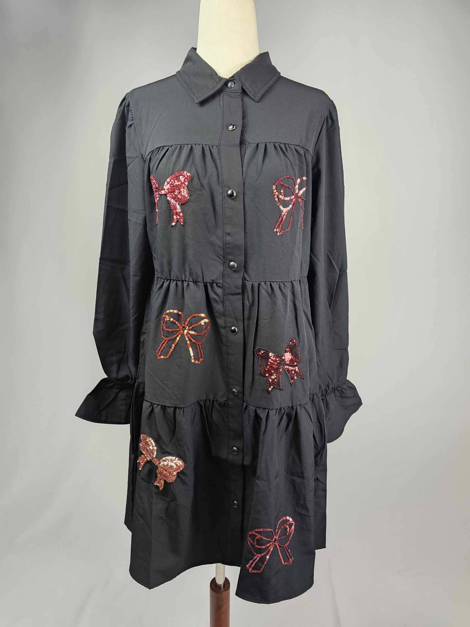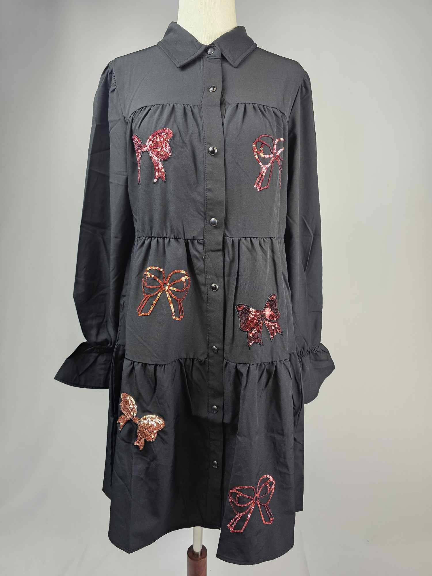 This stunning dress features a playful blend of elegance and whimsy, perfect for any special occasion. The long sleeves are adorned with soft, puffed detailing, adding a touch of romance. The bodice is beautifully embellished with shimmering sequins bows, catching the light with every movement. A charming bow accent cinches the waist, enhancing your silhouette. This dress features a flattering and graceful look. Ideal for evening events or festive celebrations, this dress combines sophistication with a fun, youthful spirit.