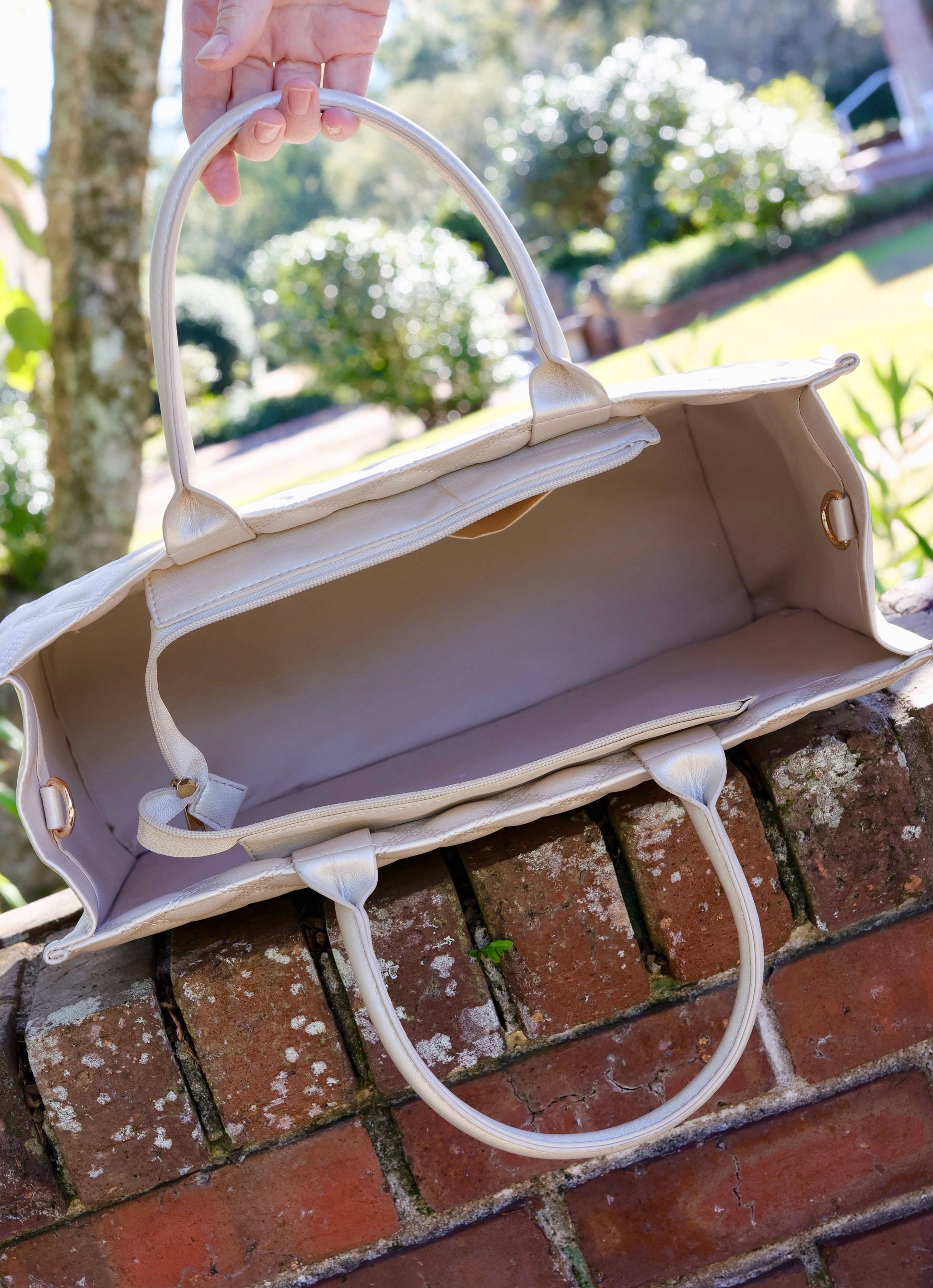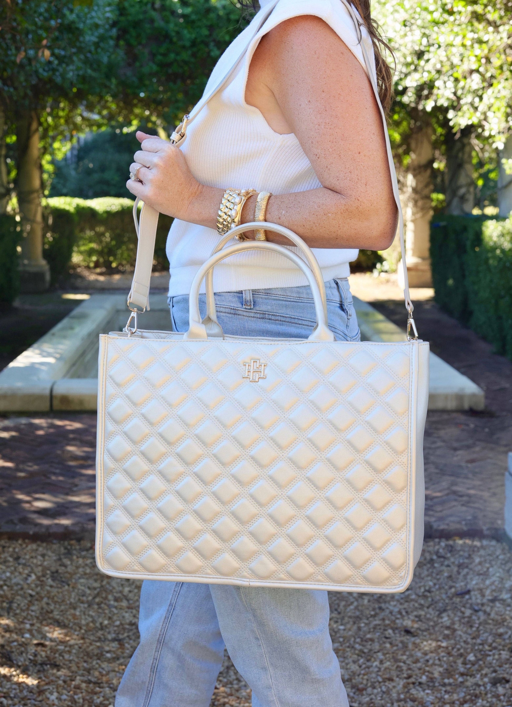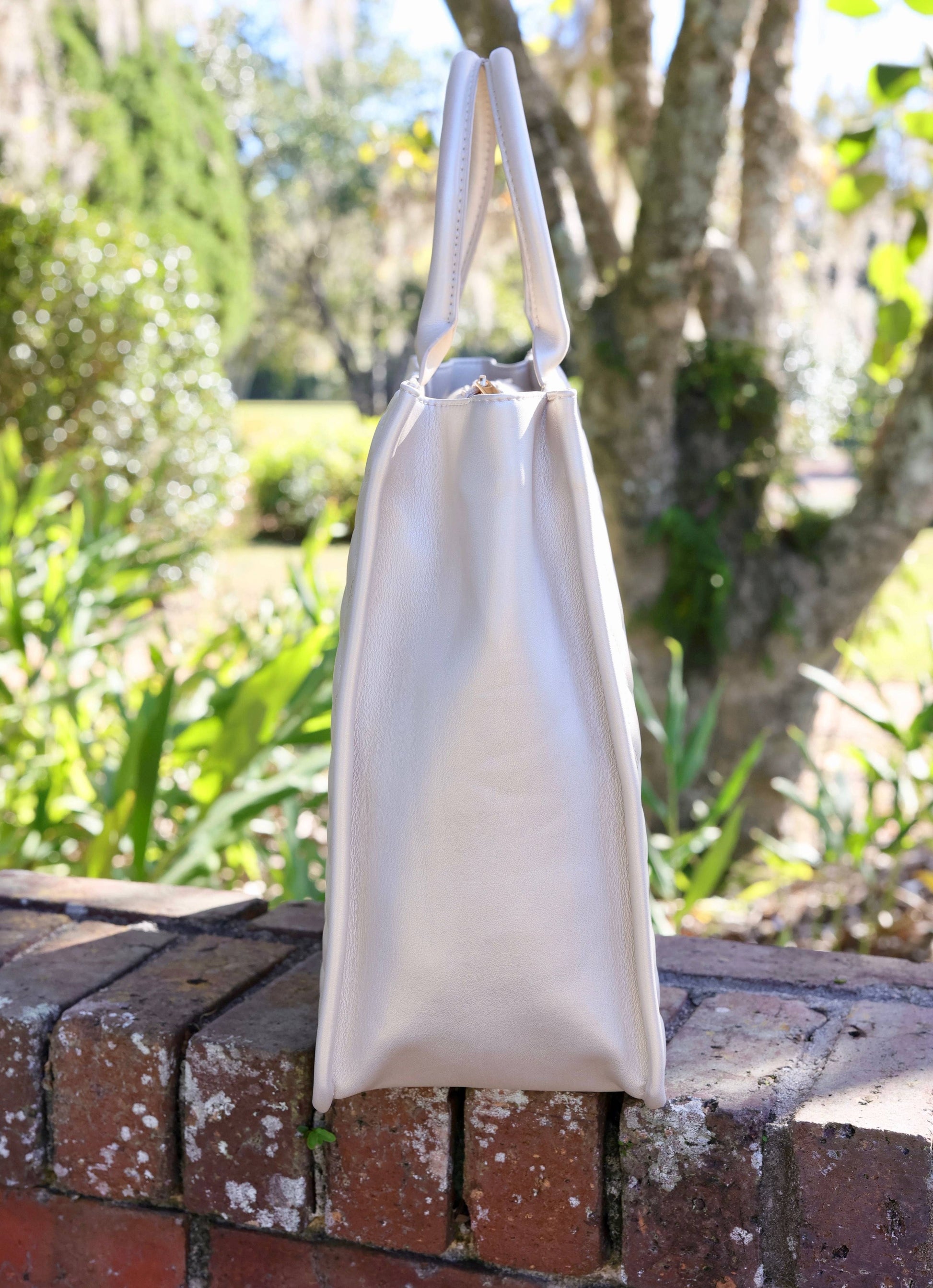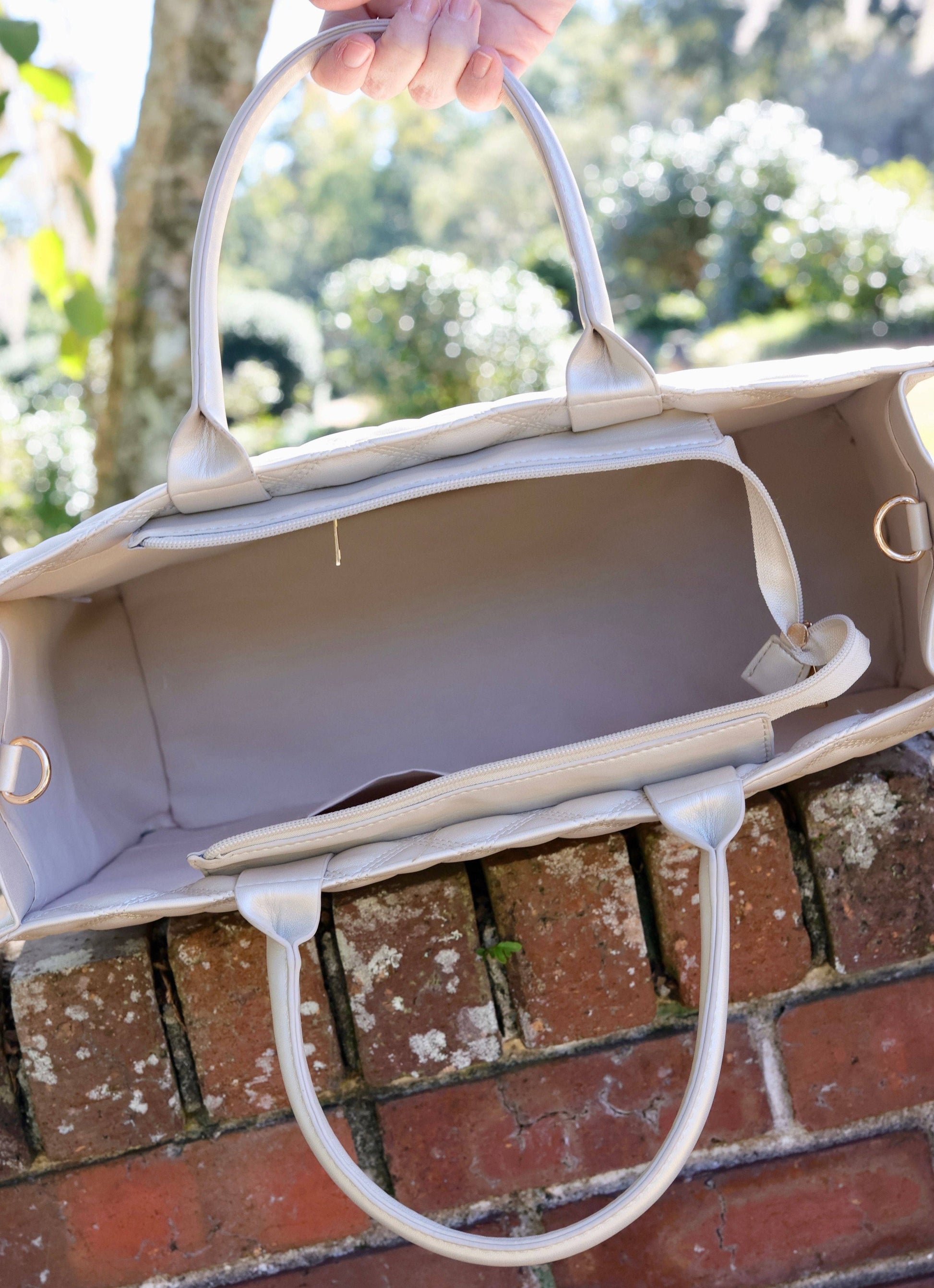 This oversized tote is functional and stylish. It is so roomy and will hold all of your necessities and more. Perfect for business, travel, and leisure. It is made with an ultra soft vegan leather material and features the Caroline Hill logo at the top of one side of the bag. There are two top carrying handles as well as an adjustable strap that is removable. It has a top zipper closure with two interior open pockets and one zippered pocket. There is also a removable bottom insert to ensure your bag holds it's shape well.
