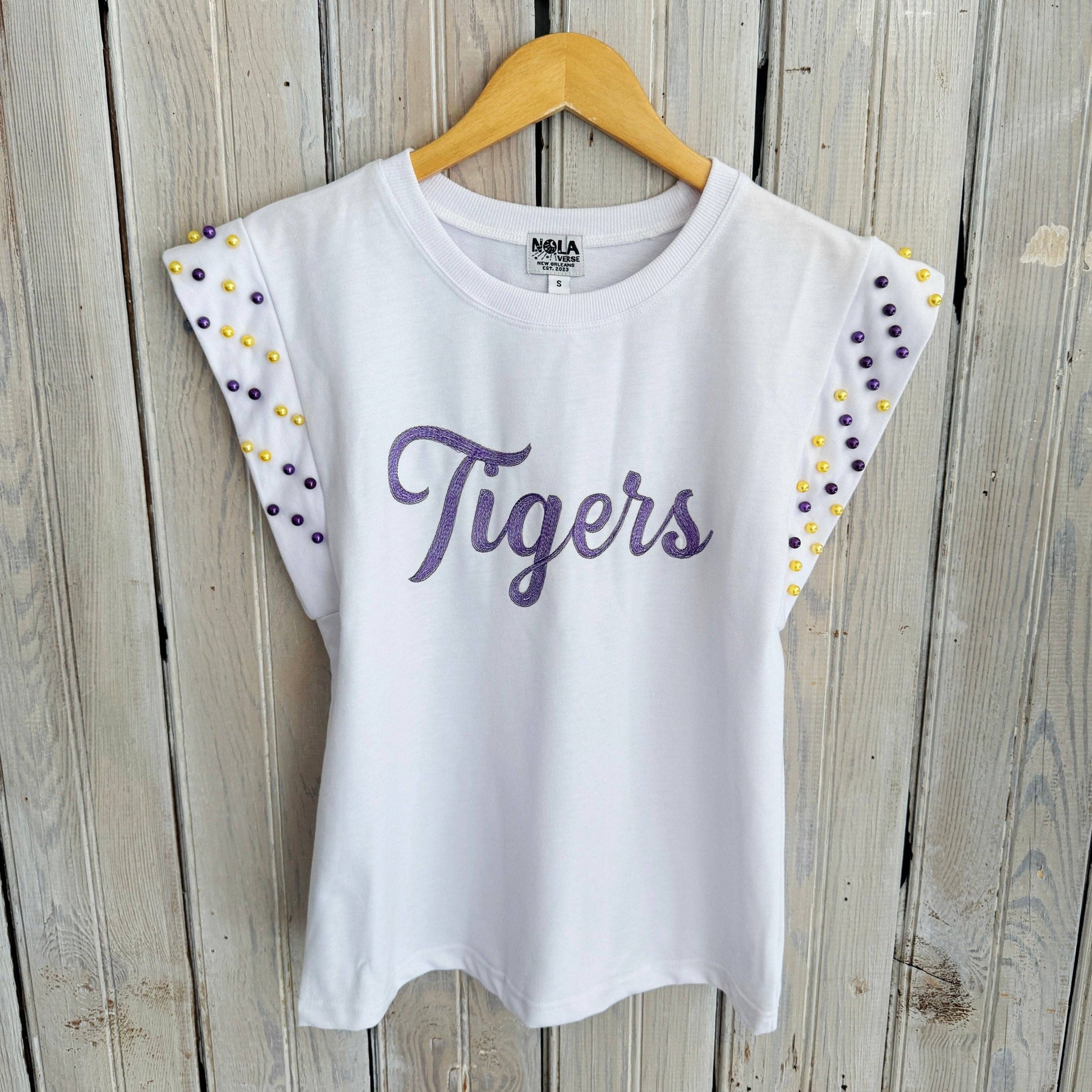 Fitted, consider sizing up. LSU Tigers Gameday White Blouse Yellow and Purple Pearls. Flutter Cap Sleeve. Designed & Printed in NOLA