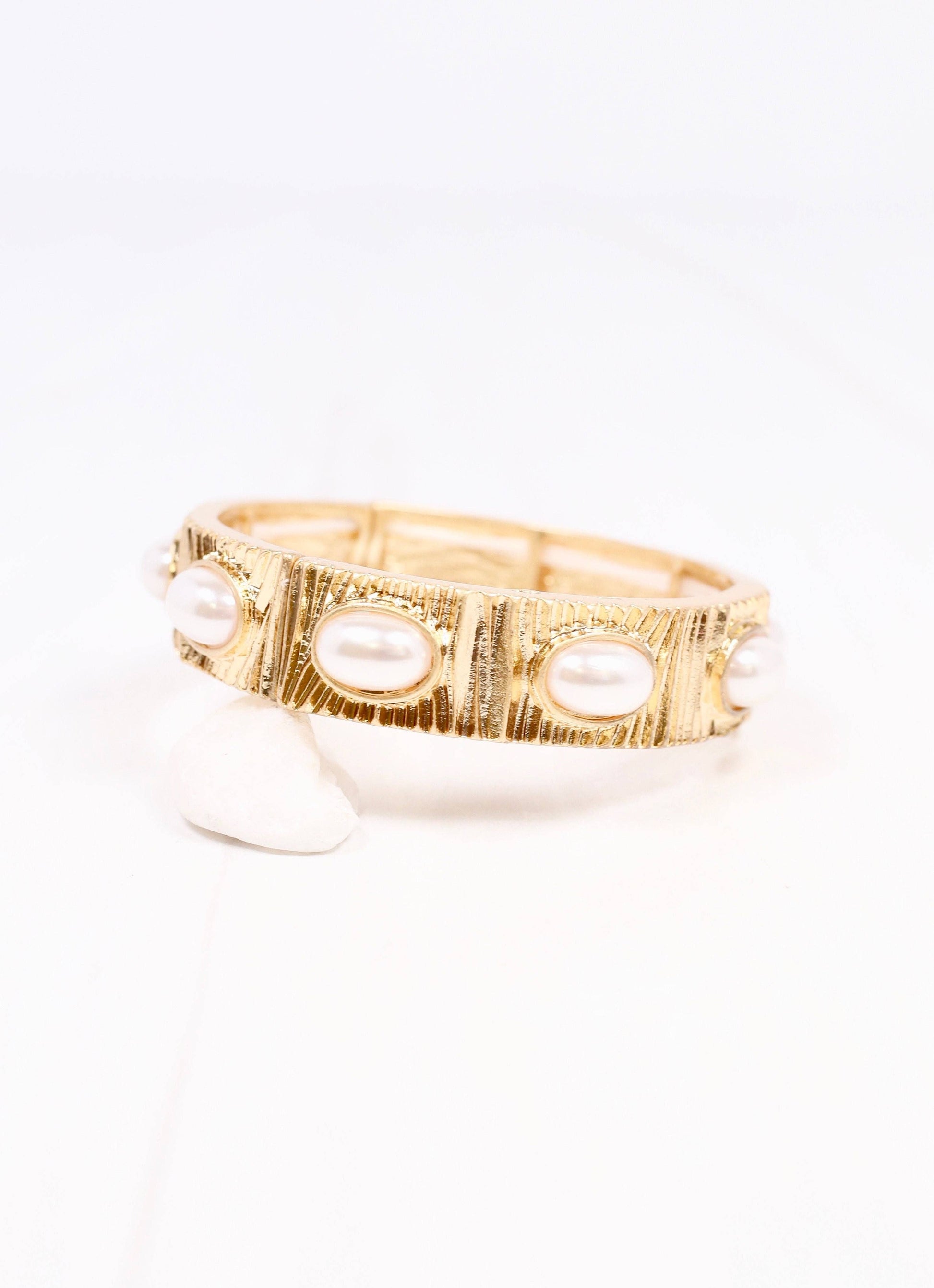 This stretch bracelet has a classy look designed to pair well with any outfit. It has a ribbed texture with oval shaped pearl accents. It wears like a bangle and stretches to fit most wrists. Wear by itself, stacked with multiples of the same style, or mixed with other bracelets for a variety of looks.