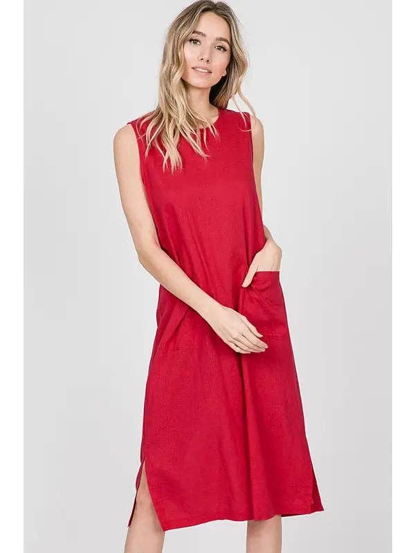 RED SLEEVELESS FRONT PATCH POCKETS MIDI DRESS