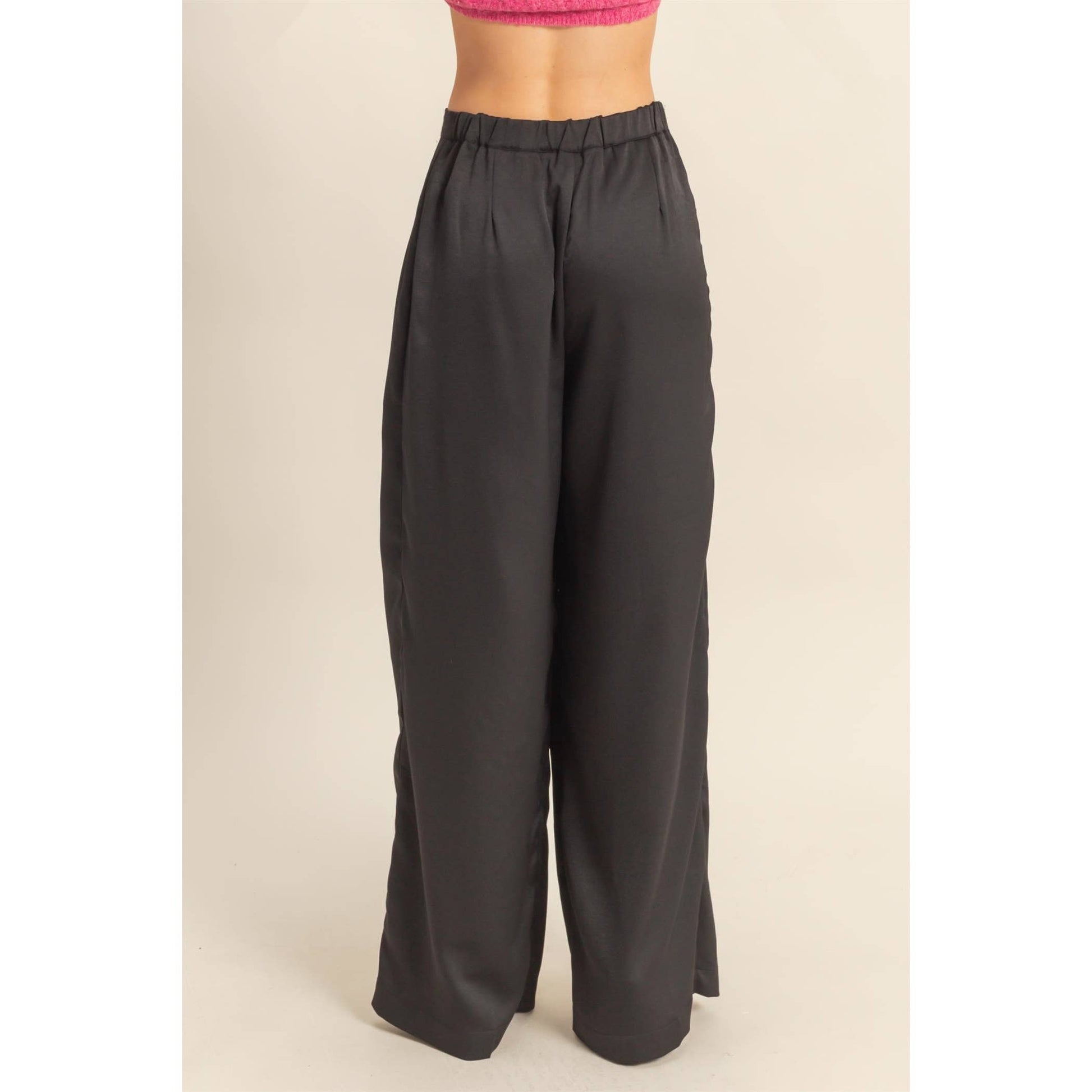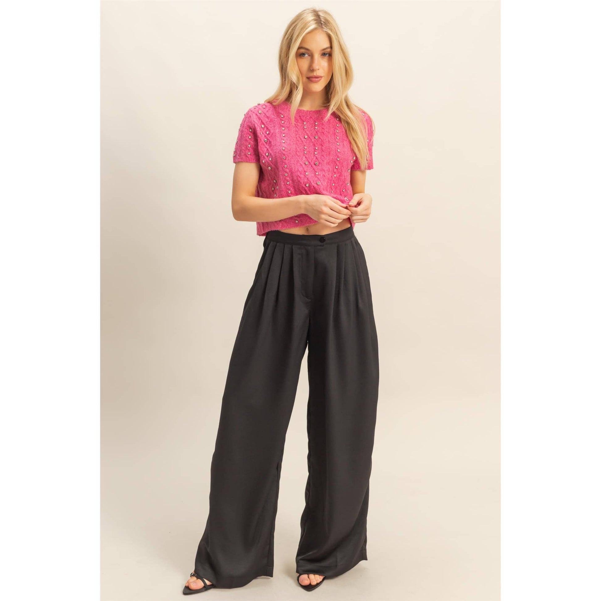 Introducing the quintessence of modern elegance and comfort, these wide-leg palazzo pants are a must-have for any fashion aficionado. Crafted with exquisite pleated detailing at the waist, these pants offer a flattering fit that gracefully elongates the silhouette. The structured waistband and fluid drape ensure they transition seamlessly from a day at the office to an evening event. Model Is 5' 6" Tall, 32" Chest, 24" Waist, 32" Hips And Wearing A Size Small Imported. Designed In The USA
